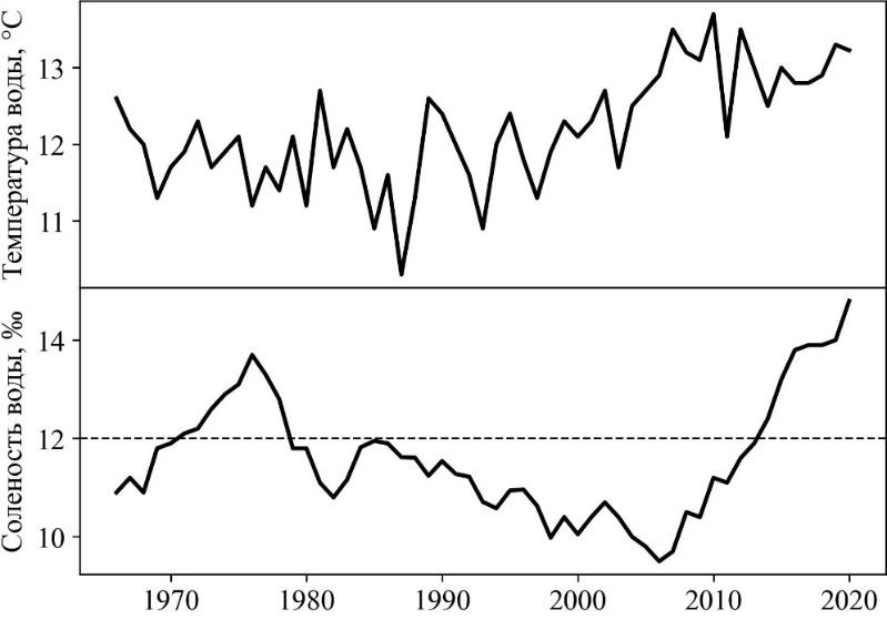 В 2007–2019 гг. экосистема моря по комплексу гидрологических показателей перешла в состояние, которое не наблюдалось за период инструментальных наблюдений [1]. В первом десятилетии XXI в. увеличилась средняя по морю годовая температура воды на фоне относительно низкой солености вод, затем в условиях маловодья на Дону (а потом и на Кубани) начался стремительный рост солености при незначительном снижении среднегодовой температуры вод (рис. 1).