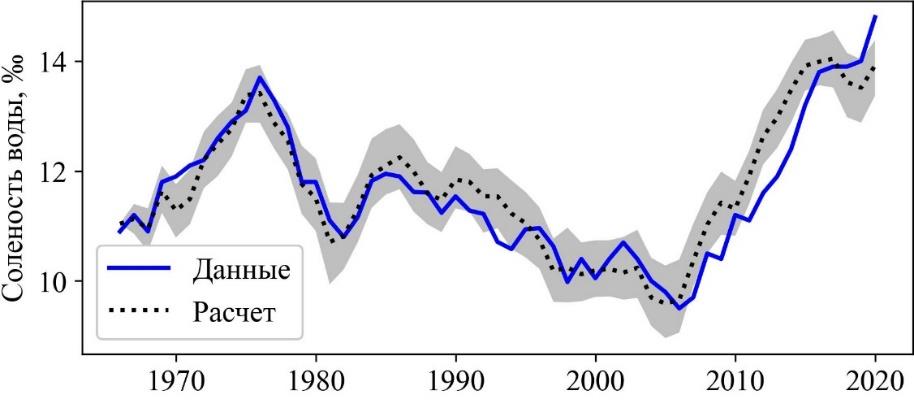 Если сравнивать между собой два периода осолонения (1972–1978 гг. и 2007–2020 гг.), то приток черноморских вод примерно одинаков: 40,3 (35,4–48,0) и 41,0 (35,4–45,3) км3/год соответственно. Поэтому повышенная адвекция вод из Черного моря в ответ на изменение пресноводного баланса не может быть единственной причиной столь стремительного роста солености в современное время. В длительный период распреснения (1979–2006 гг.) приток черноморской воды был в среднем на 6 км3/год меньше при сохранении межгодовой изменчивости – 34,3 (27,7–42,5) км3/год.