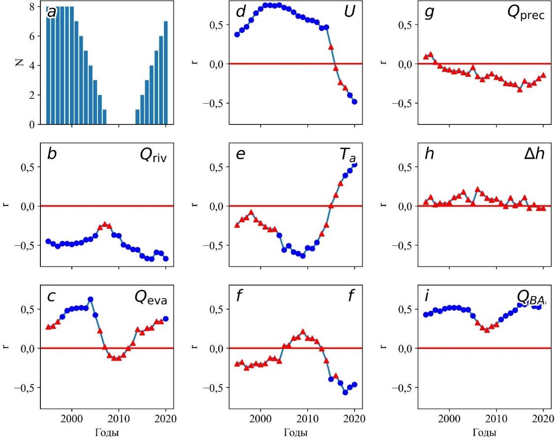 Рис. 4. Гистограмма количества лет N с высокой соленостью Азовского моря (более 12 ‰), попавших в соответствующее скользящее окно (a), и динамика изменения коэффициентов корреляции r между соленостью и следующими характеристиками: речным стоком Qriv (b); испарением Qeva (c), скоростью ветра U (d), температурой воздуха Ta (e), относительной влажностью f (f), осадками Qprec (g), изменением уровня моря ∆h (h), притоком воды из Черного моря QBA (i). Значимые коэффициенты корреляции отмечены синим кружком, незначимые – красным треугольником