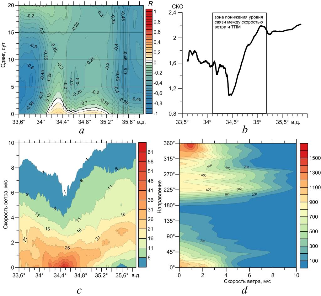 В работе была проанализирована повторяемость среднесуточных значений модуля скорости с дискретностью 1 м/с (рис. 6, c) вдоль изобаты 50 м за период 1 июня – 31 августа 2022 г., а также общая повторяемость (количество суток) ветров определенной скорости в зависимости от направления (рис. 6, d). Анализ показал, что в районе незначимой связи скорости ветра и ТПМ отмечалась максимальная повторяемость ветров минимальной скорости (ниже 1,5 м/с) (рис. 6, c) северного и северо-западного направлений (рис. 6, d). Максимальная повторяемость слабых ветров основного северного направления на участке полигона примерно между 34° и 35° в. д. обусловлена экранирующим эффектом Крымских гор.