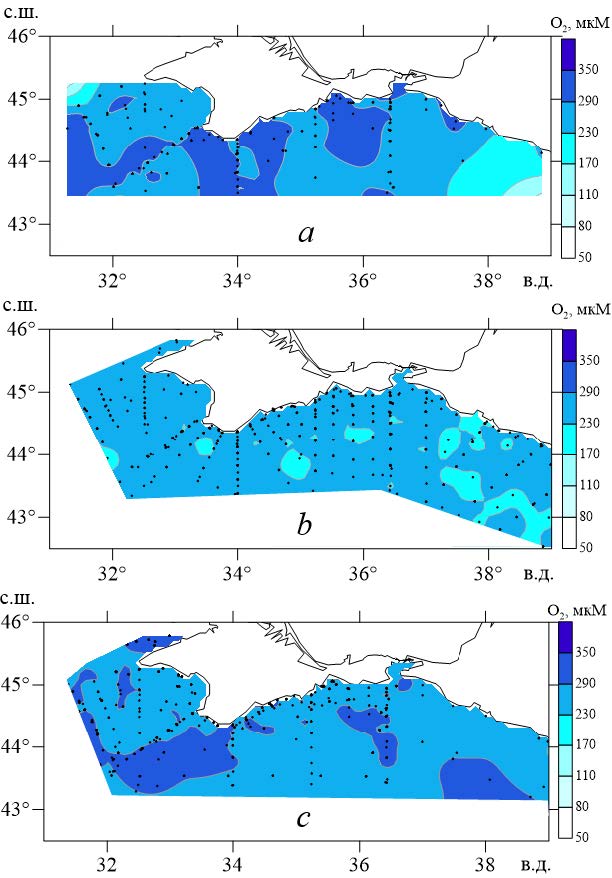 Рис. 2. Пространственная изменчивость концентрации растворенного кислорода в поверхностном слое вод Черного моря в весенний (а), летний (b) и осенний (с) периоды