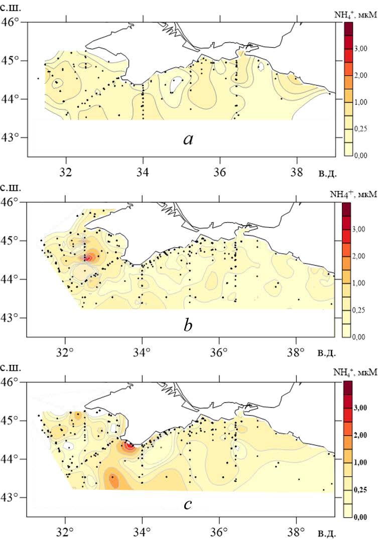 Рис. 3. Пространственная изменчивость концентрации аммонийного азота в поверхностном слое вод Черного моря в весенний (а), летний (b) и осенний (с) периоды