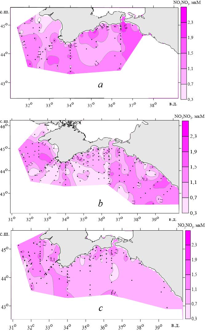 Рис. 4. Пространственная изменчивость концентрации окисленного азота в поверхностном слое вод Черного моря в весенний (а), летний (b) и осенний (с) периоды