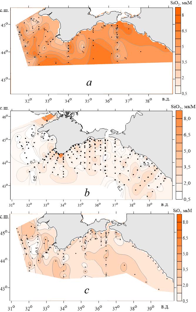 Рис. 6. Пространственная изменчивость концентрации кремнекислоты в поверхностном слое вод Черного моря в весенний (а), летний (b) и осенний (с) периоды