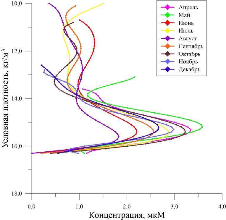 Содержание фосфатов после появления оксиклина на σt = 14,4–14,5 кг/м3 постепенно увеличивается с глубиной, достигая концентраций > 1 мкМ на σt = = 15,5 кг/м3. Затем концентрация уменьшается и составляет ˂ 0,5 мкМ при σt = = 15,8 кг/м3, далее монотонно увеличивается до 6,5–8,0 мкМ на изопикнической поверхности 16,2 кг/м3.