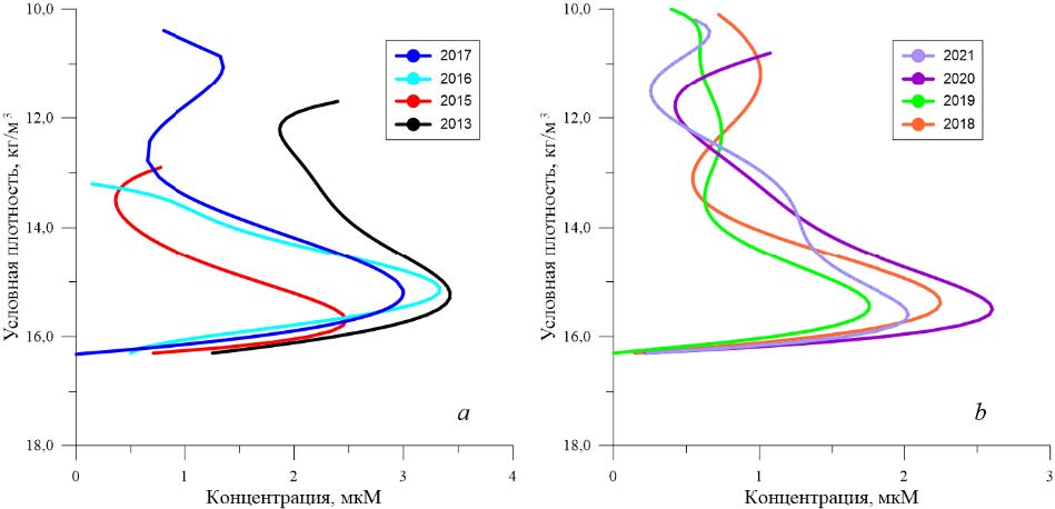 В последующие годы максимальные концентрации суммы нитратов и нитритов отмечались на изопикнических поверхностях ~ 14,5–16,0 кг/м3 (рис. 11, b) и составляли 1,8–2,6 мкМ. Эти значения соответствуют доэвтрофикационным показателям [4], что может указывать на снижение антропогенной нагрузки на экосистему Черного моря.