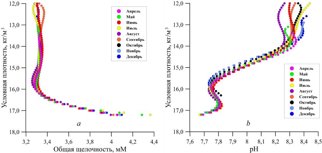 Карбонатная система. Сезонная изменчивость параметров карбонатной системы северной части Черного моря наблюдается только в верхней части вертикального профиля (рис 14, а, b) при значениях условной плотности ˂ 13 кг/м3 для общей щелочности и ˂ 14 кг/м3 – для рН, что соответствует глубинам ˂ 50 м. Она связана в первую очередь с процессами фотосинтеза и разложения органического вещества, в результате которых из воды изымается или поступает углекислый газ, переходящий в воде в формы гидрокарбонатов и карбонатов. Кроме того, на сезонные изменения рН в поверхностных водах оказывают влияние гидрологические условия (изменения температуры) и поступление карбонатов с речным стоком, а также водообмен с Азовским морем через Керченский пролив.