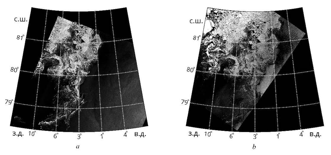 F i g. 1. A pair of Sentinel-1A (a) and Sentinel-1B (b) radar images for September 15, 2018 with the drifting ice present in the marginal ice zone of Fram Strait