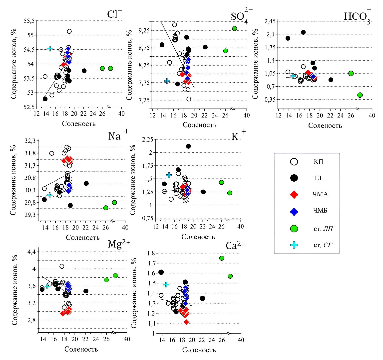 При сравнении вод исследуемых акваторий и СМВ обнаружено, что ОИС Керченского пролива и прилегающих акваторий отличался от океанского повышенным в среднем до 1% содержанием сульфатов, в 3−6 раз – гидрокарбонатов и пониженным в среднем до 2% содержанием хлоридов. Эти отличия проявлялись тем ярче, чем бóльшая доля в образце принадлежала пресноводному материковому стоку или трансформированным водам Таманского залива, где, например, сульфат-хлорное соотношение было выше, чем в Черном море и Керченском проливе. Ионные вариации способствовали занижению значений солености при ее расчете по данным CTD-зондирования во всех исследуемых водах. Для образцов Керченского пролива, и, вероятно, Черного моря это занижение составило в среднем 2,5%, что соответствует сумме ионов ~ 0,5. При расчете солености с использованием хлорного коэффициента обнаружены отклонения: в Керченском проливе они составляют ~ 2,3%, в Таманском заливе ~ 2%, в Черном море ~ 2,5%.