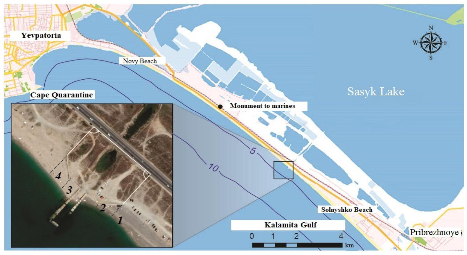 Рис. 1. Карта-схема северной части Каламитского залива. На врезке – спутниковый снимок водозабора морской воды на пересыпи оз. Сасык, цифрами показаны место-положение и номера створов