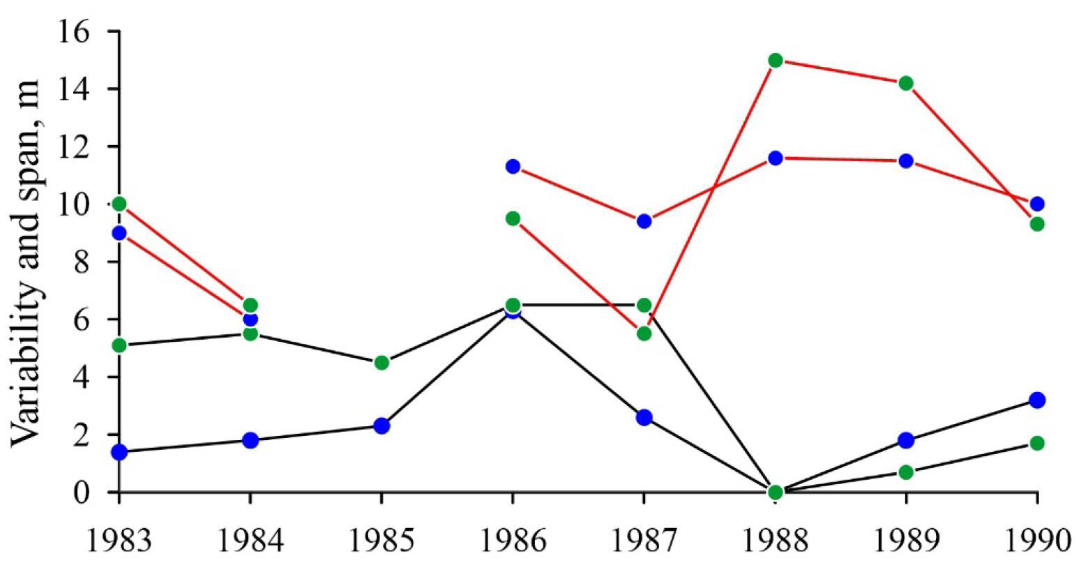 В межгодовой изменчивости статистически значимые тренды не выделяются. Максимальный размах межгодовых колебаний составляет 5,8 м на створах 1, 2 и 7,2 м – на створах 3, 4. Сезонная изменчивость существенно выше: так, на створах 1, 2 их максимальный размах составляет 14,6 м, на створах 3, 4 – 26,7 м. Другими словами, размах сезонной изменчивости в три раза больше, чем межгодовой, что соответствует значениям, приведенным выше для берега без гидротехнических сооружений. Вместе с тем размах колебаний примерно в два раза больше.