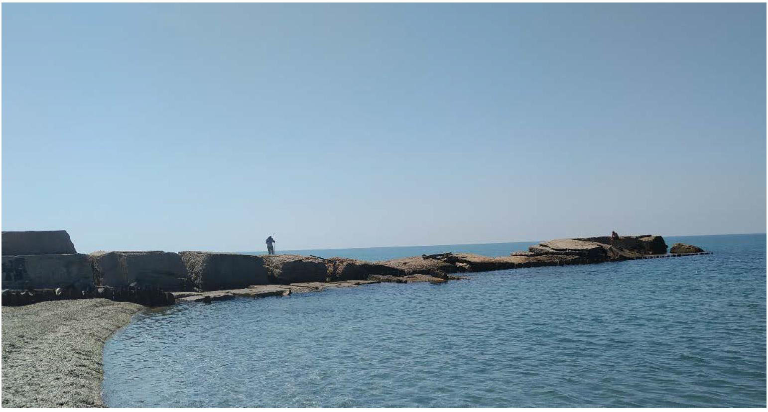 Наибольший интерес вызывают данные, полученные на четырех створах в районе водозабора в центральной части пересыпи (2006–2014 гг.). Водозабор морской воды для добычи соли предприятием «Сольпром» был построен в середине 1960-х гг. в центральной части пересыпи оз. Сасык. Это поперечное берегу П-образное железобетонное сооружение имеет длину 68 м, глубина у морской грани 3 м. С 1990-х гг. оно не используется по прямому назначению и находится в полуразрушенном состоянии (рис. 3).
