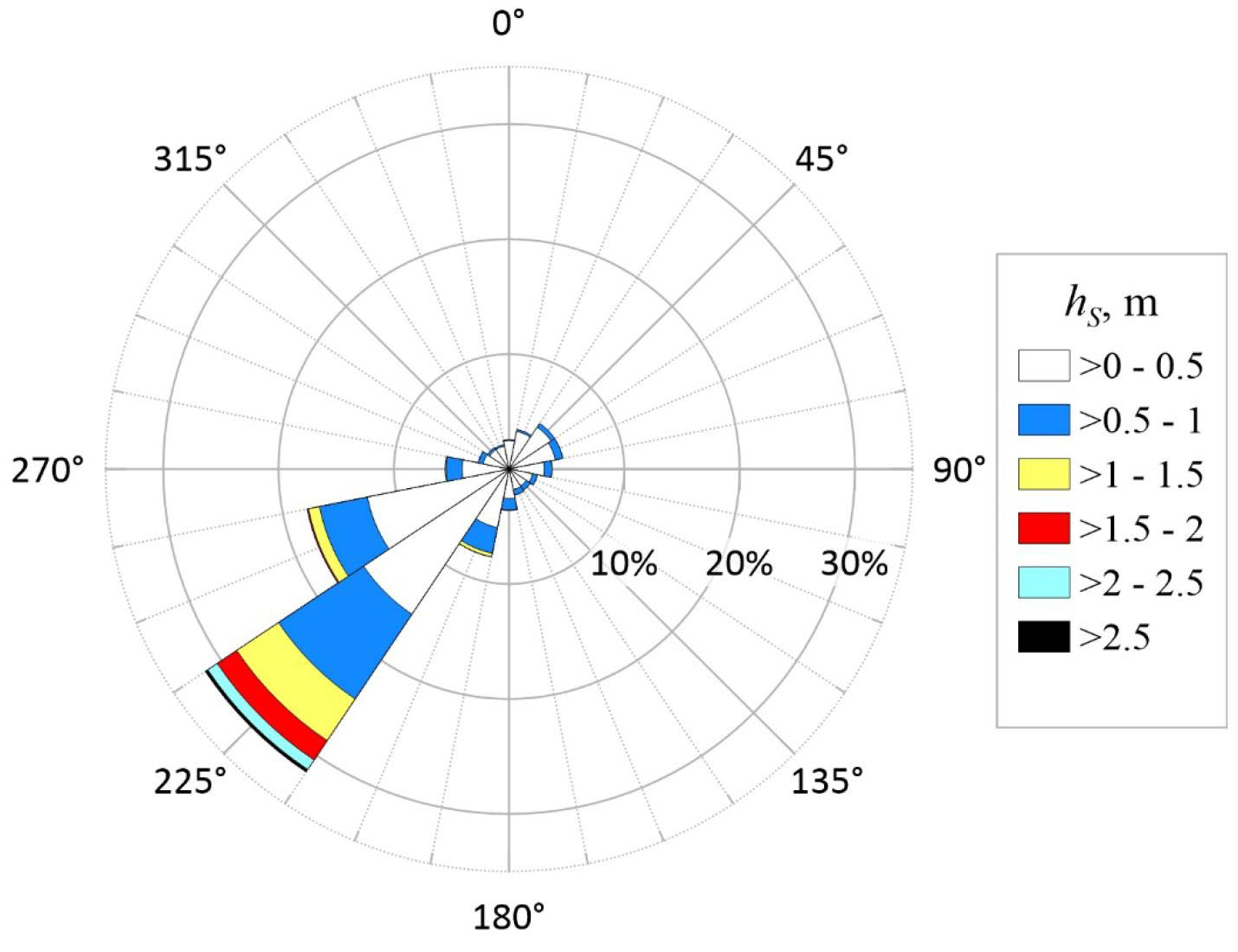 Определяющее влияние на литодинамические процессы в районе пересыпи оз. Сасык оказывает волновой климат. Для его исследования были использованы данные реанализа ветрового волнения в Черном море за период 1979–2022 гг. (далее – массив SWAN-ERA). Массив получен с помощью модели SWAN 7 на неструктурированной расчетной сетке со сгущением в прибрежной зоне [8]. В качестве атмосферного форсинга использованы данные реанализа ERA-Interim и ERA5 с сайта apps.ecmwf.int. Из массива SWAN-ERA был выбран ближайший к технологическому сооружению узел расчетной сетки с глубиной ~ 6,8 м и сформированы многолетние ряды, включающие скорость и направление ветра , высоту значительных волн , средний период волн , среднее направление волнения . Дискретность рядов составляла 1 ч.