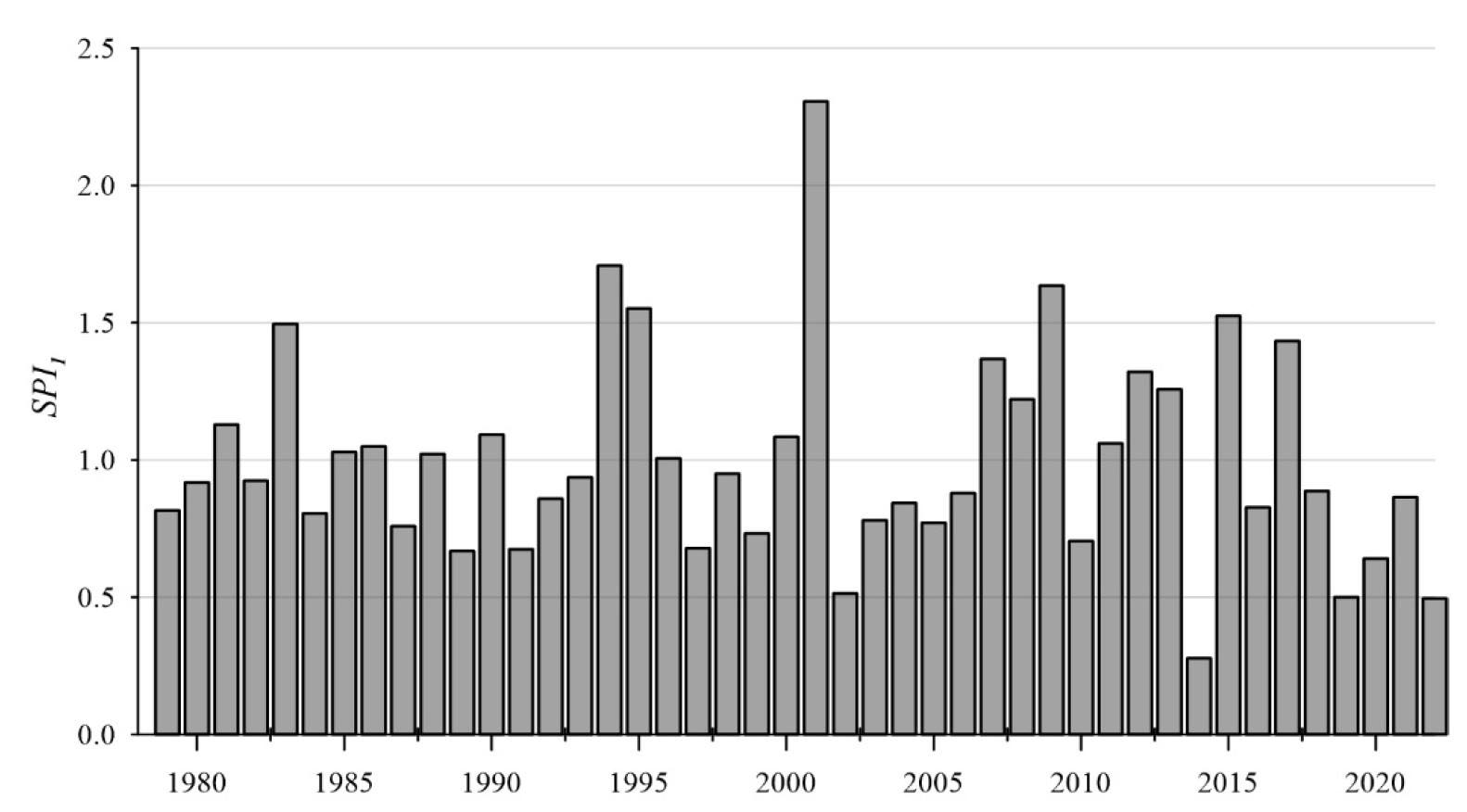 На рис. 12 показано распределение суммарного по годам безразмерного индекса мощности шторма SPI1 = SPI/SPI0, где SPI0 = 0,573·106 м2·ч – среднее значение SPI. На этой гистограмме выделяются 5 лет (1994, 1995, 2001, 2009 и 2015 гг.) с повышенной штормовой активностью (SPI1 > 1,5). Примечательно, что в этот перечень не входит 2021 г., который отличается максимальной общей продолжительностью штормов (рис. 11).