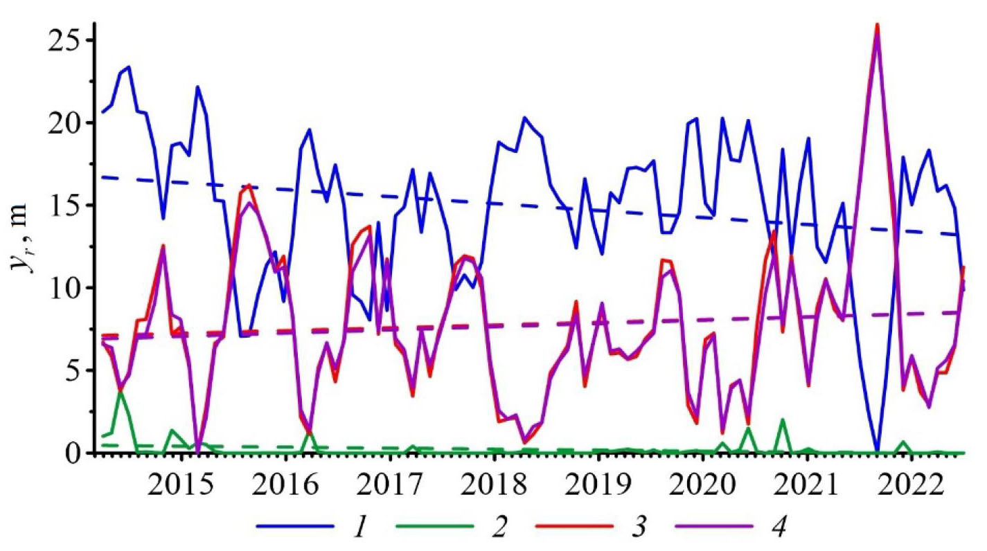 Для каждого створа 1–4 были найдены минимальные значения расчетных приращений ∆yimin и построены графики расчетных относительных приращений yri(x) = ∆yi – ∆yimin для моделируемого периода времени 12 марта 2014 г. – 23 июля 2022 г. (рис. 15). На рисунке также приведены тренды (штриховые прямые того же цвета), соответствующие относительным приращениям для каждого створа.
