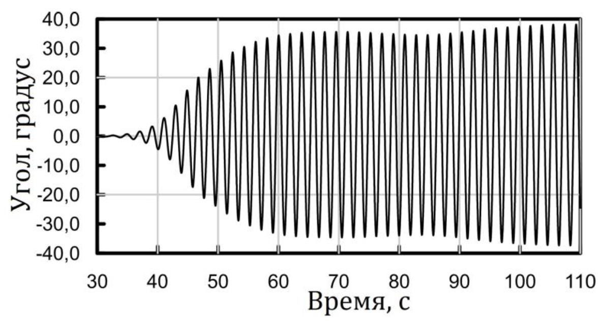 Регулярные волны подбирались до установки модели судна в бассейне с периодом, равным 1,89 с, высотой 60 мм и углом волнового склона, равным 1,9°. Бортовая качка модели в условиях такого волнения составила около 35°. На рис. 11 представлен фрагмент видеозаписи бортовых колебаний модели, а на рис. 12 реализация бортовых колебаний, измеренных оптической системой.