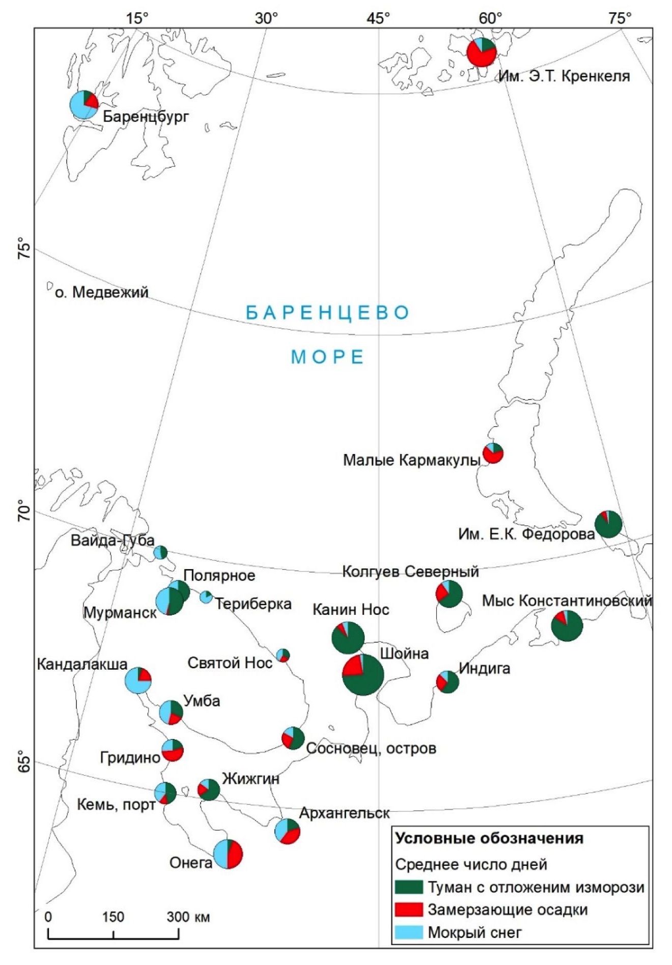 Полученные данные о среднем за год числе дней с атмосферными явлениями, которые могут приводить к образованию опасных гололедно-изморозевых отложений на территории побережья Баренцева моря и в его акватории, представлены в табл. 2.