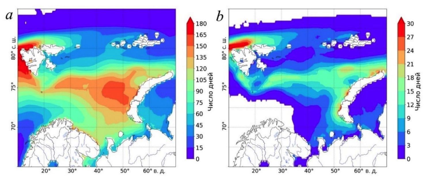 Р и с. 3. Среднегодовое число дней с обледенением (a) и с экстремальным обледенением (PPR > 83) (b) судов в Баренцевом море за период с 1979 по 2022 г.