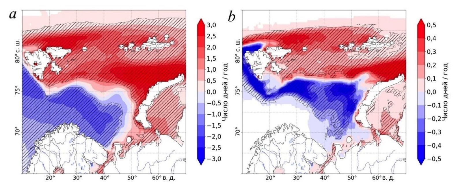 Р и с. 5. Временное изменение повторяемости обледенения судов в Баренцевом море за период 1979–2022 г. для общего числа дней с обледенением (a) и числа дней с экстремальным обледене-нием (b). Штриховкой обозначены области, в которых полученные тренды являются достовер-ными для 1%-го уровня значимости