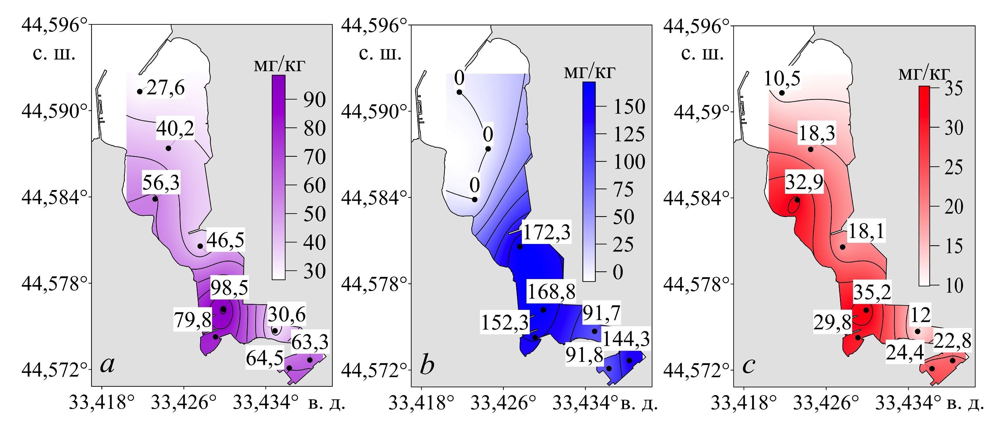 4. F i g. 3. Spatial distribution of hydrocarbons (a), UCM (b), and n-alkanes (c) in the bottom sediments surface layer of Kamyshovaya Bay