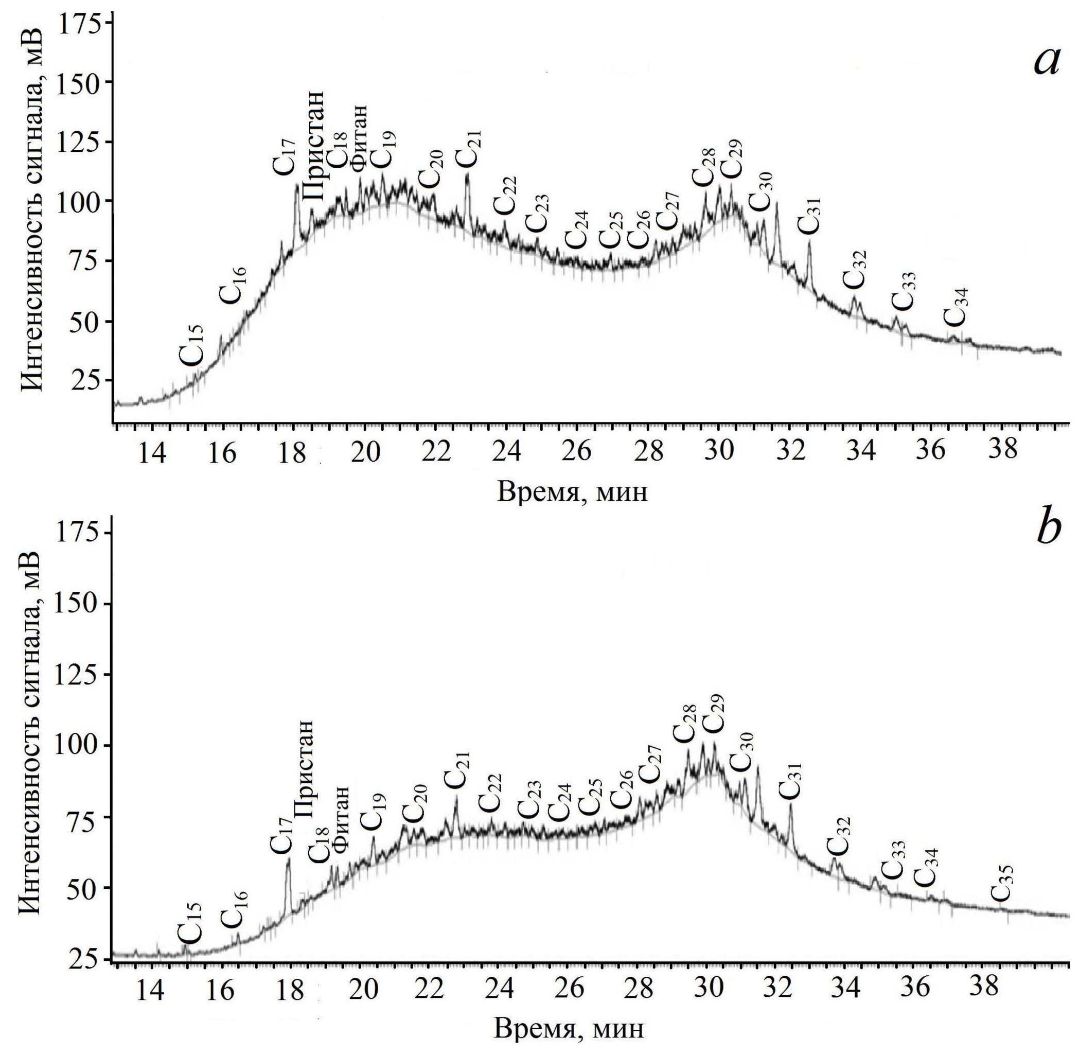 5. F i g. 4. Typical chromatograms of bottom sediments in Kamyshovaya Bay: a – station 38 (distribution due to a few sources); b – station 35a