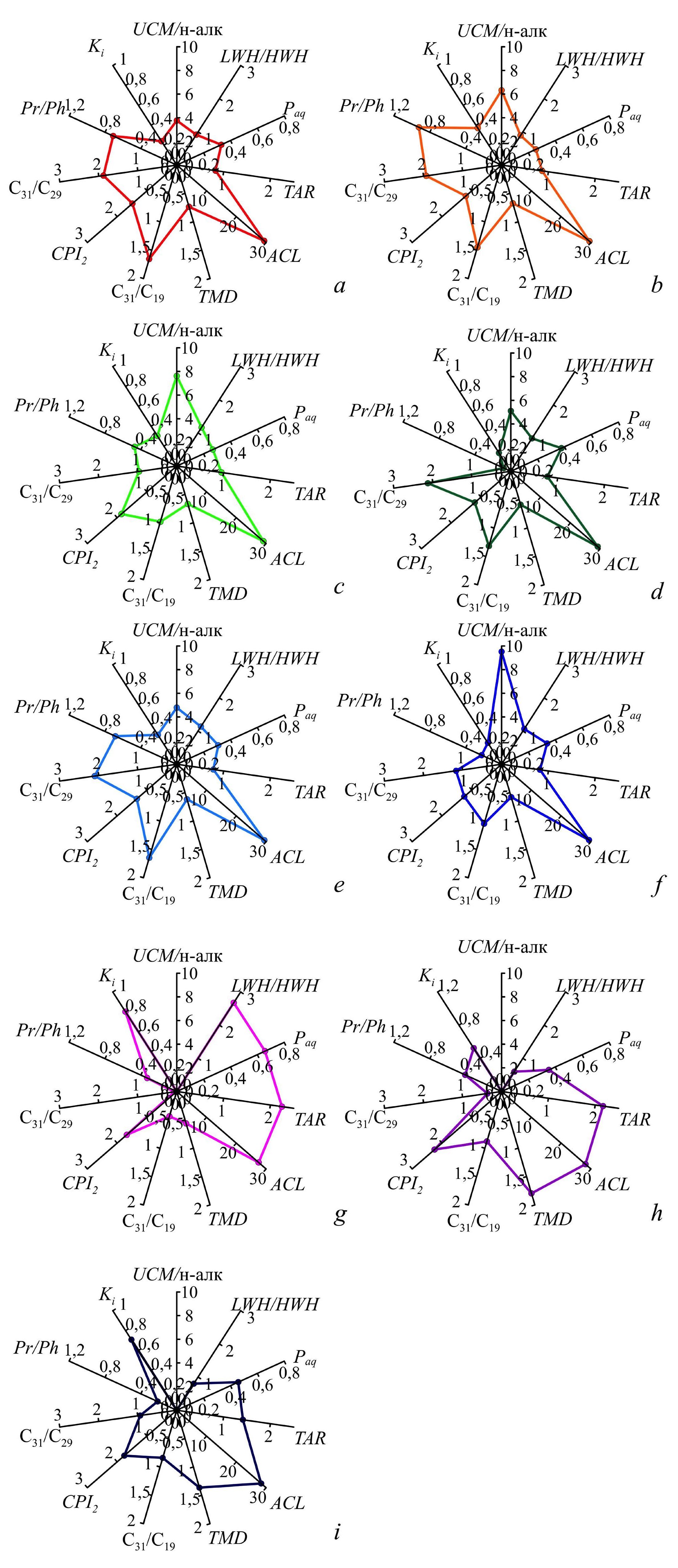 7. F i g. 6. Ratio of the main markers in bottom sediments of Kamyshovaya Bay by station: a – 35a; b – 35; c – 36; d – 37; e – 38; f – 39; g – 40; h – 41; i – 42