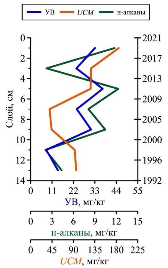 Соотношение UCM/н-алканы изменялось в пределах от 4,54 до 37,22. Минимальные соотношения отмечены в слоях 6–8 и 8–10 см в период с 2001 по 2009 г. Максимальное значение этого соотношения (37,22) наблюдалось в слое 10–12 см, что соответствовало периоду 1996–2000 гг. Значения индекса LWH/HWH составили 0,66–1,09 при среднем 0,87, что указывает на поступление терригенного вещества [24].