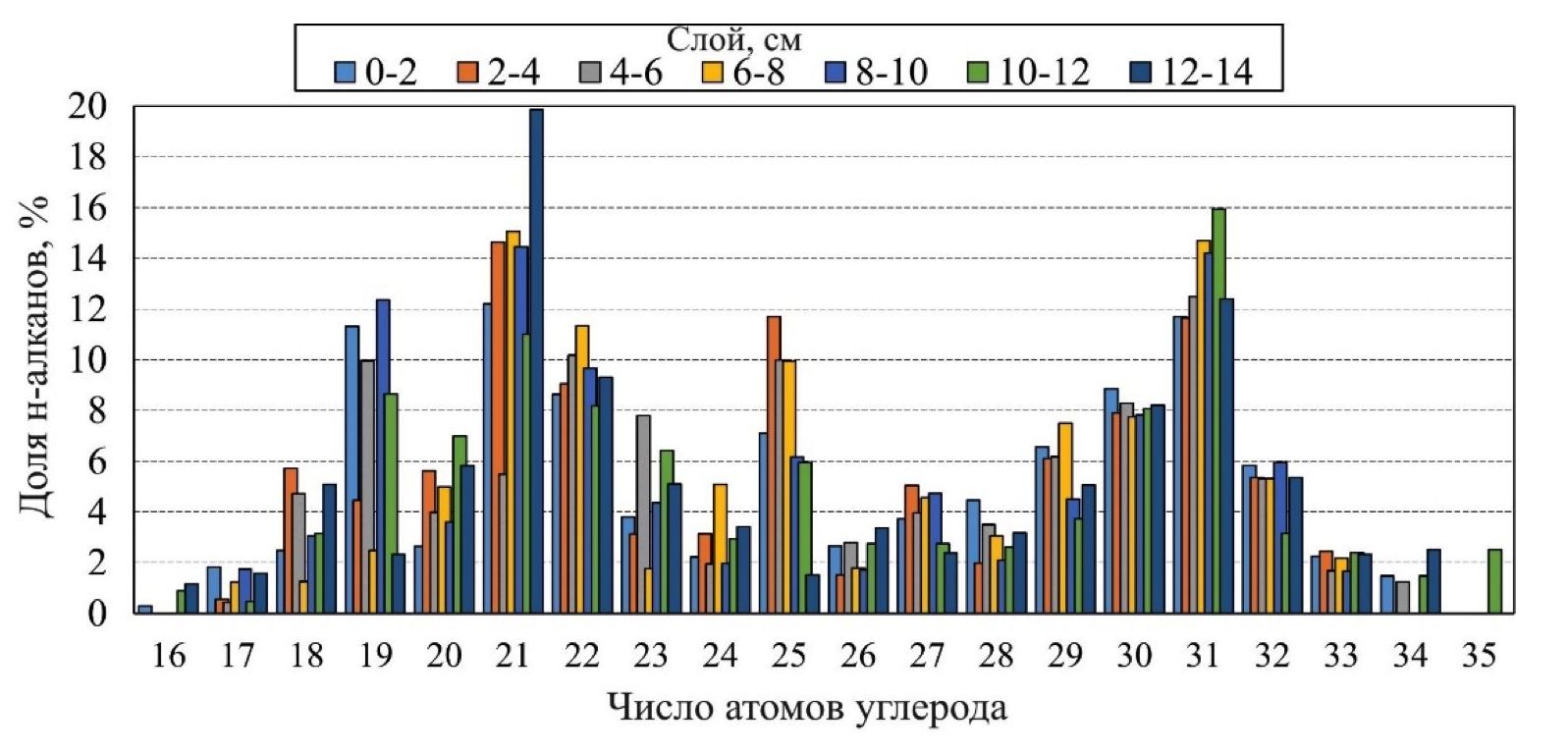 9. F i g. 8. Content of n-alkanes in the bottom sediments column of Kamyshovaya Bay (station 39)