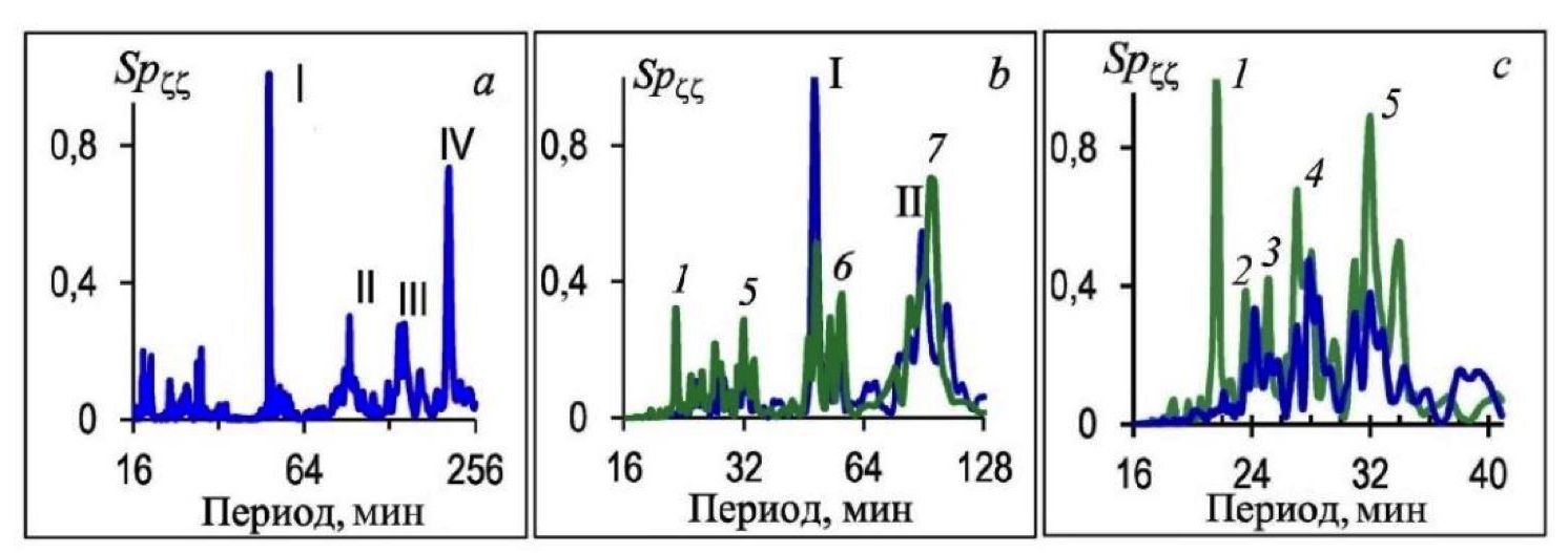 Спектр на рис. 4, a характеризуется дельтообразным максимумом на периоде T0 ~ 47 мин, отмеченным римской цифрой I, и менее интенсивным, отмеченным цифрой II, широкополосным максимумом на периоде T1 ~ 96 мин. В диапазоне периодов, превышающих 100 мин, зафиксированы два максимума, отмеченные римскими цифрами III и IV.