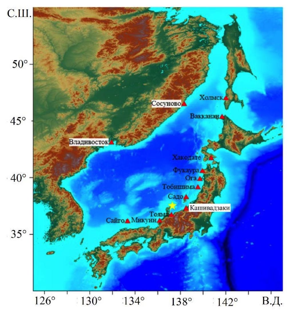 Мы рассматриваем сильное землетрясение (М = 7,6), произошедшее 1 января 2024 г. на п-ове Ното в префектуре Исикава, Япония. В результате серии подземных толчков были вызваны массовые разрушения в городах Судзу, Ваджима, Ното и Анамидзу. При этом в соседних префектурах Тояма и Ниигата также зафиксирован значительный ущерб. В результате этого землетрясения в ряде регионов о-ва Хонсю была объявлена угроза цунами. Японским метеорологическим агентством была выпущена карта предупреждения о цунами, по которой, предположительно, к западному побережью острова волны цунами должны были подойти высотой 5 м (рис. 1).