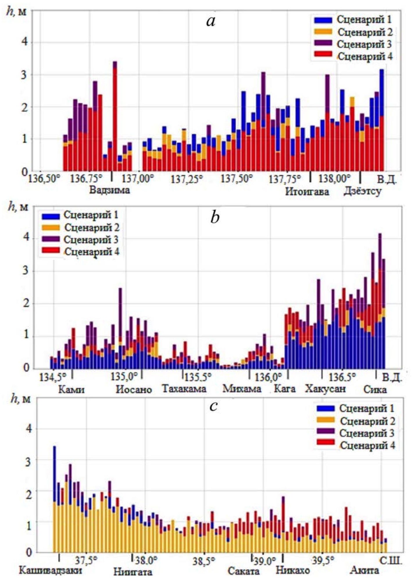 На рис. 9, а хорошо видно, что в районе пос. Вадзима высота волн в 3-м и 4-м сценариях составляет 3 м, в пунктах Итоигава и Дзёэтсу высота волн в 4‑м сценарии – не более метра, а в 1, 2, 3-м сценарии она составляет 1–1,5 м. На рис. 9, с можно заметить, что высоты волн в сценарии 1 на побережьях районов Чюба и Кансай в среднем на 0,5 м меньше, чем в сценариях 3, 4. Это обусловлено тем, что первый блок в первом сценарии располагается внутри залива Тояма, а в остальных сценариях первый блок расположен в противоположной части п-ова Ното. На рис. 9, с видно, что высота волн в сценарии 1 больше, чем в остальных сценариях, вблизи зал. Тояма (до 38° с. ш.), а севернее залива преобладают высоты волн из 4-го сценария. Это также обусловлено расположением блоков, поскольку волны с наибольшими высотами из 1-го сценария распространяются из зал. Тояма, а волны из сценариев 2, 3, 4 огибают о. Садо и достигают северной части о. Хонсю с большими амплитудами. В табл. 3 приведены данные по всем проведенным сценариям (сценарии 1–4) и натурные данные с мареографных станций 5.