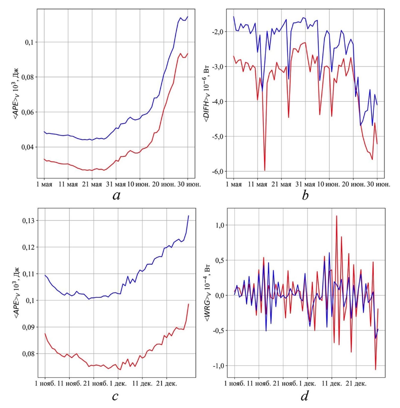 F i g. 1. Change over time of volume-average APE (a, c), horizontal diffusion of APE (b) and buoyancy work (d) for two experiments in May – June (a, b) and November – December (c, d), 2016. Red curves – experiment 1, blue curves – experiment 2