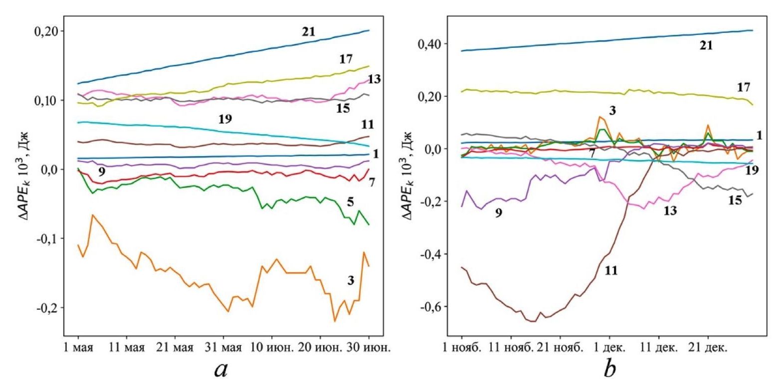 F i g. 2. Change over time of difference ∆APEk in May – June (a) and November – December (b), 2016. Numerals are the layer numbers (index k)