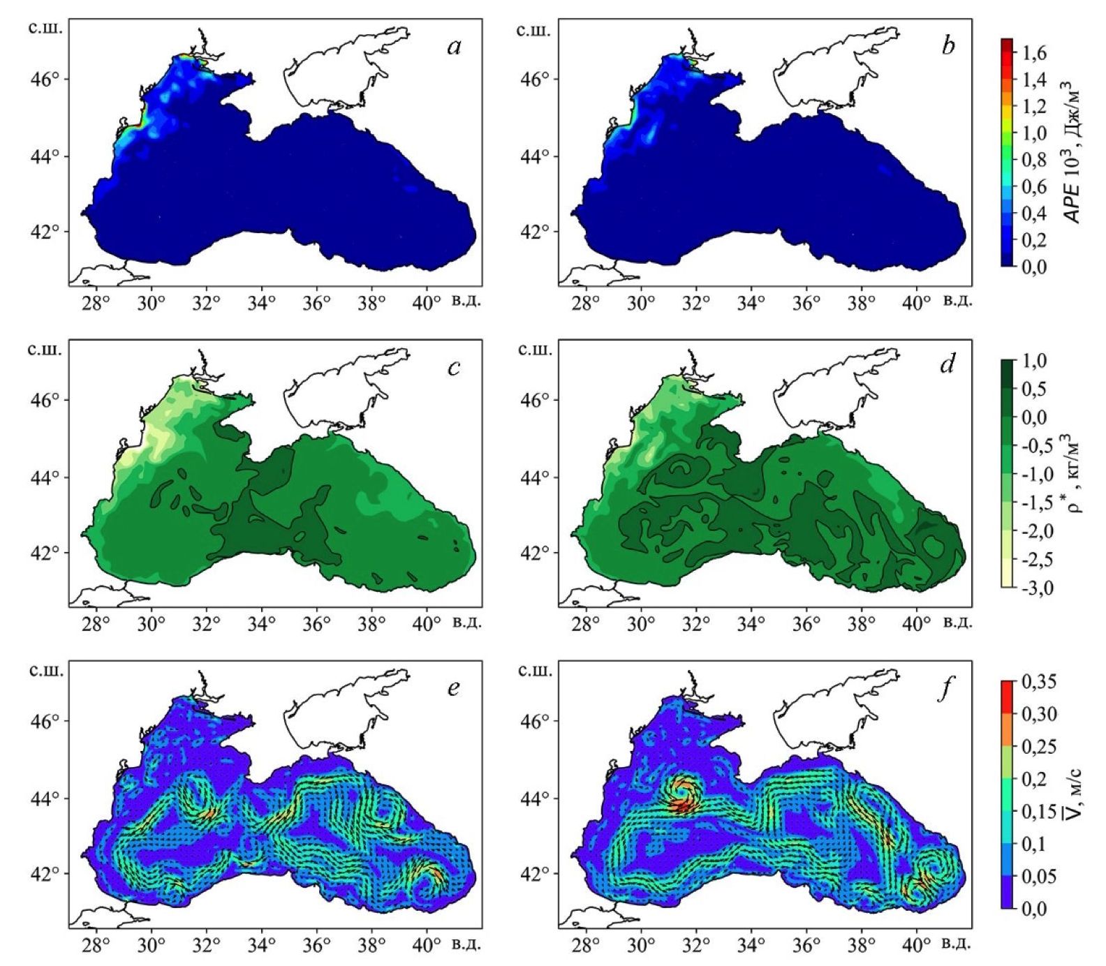 При сравнении рис. 3, c и d наблюдается разница в площади областей положительных аномалий плотности в центральной части моря, которая мало влияет на пространственное распределение АРЕ, однако проявляет сходство с полями скорости течений (рис. 3, e и f). Обширные положительные аномалии соответствуют более плотным водам внутри Основного Черноморского течения в эксперименте 2 летом, что свидетельствует о более интенсивной циклонической циркуляции (рис. 3, f) и подъеме глубинных вод в центральной части моря.