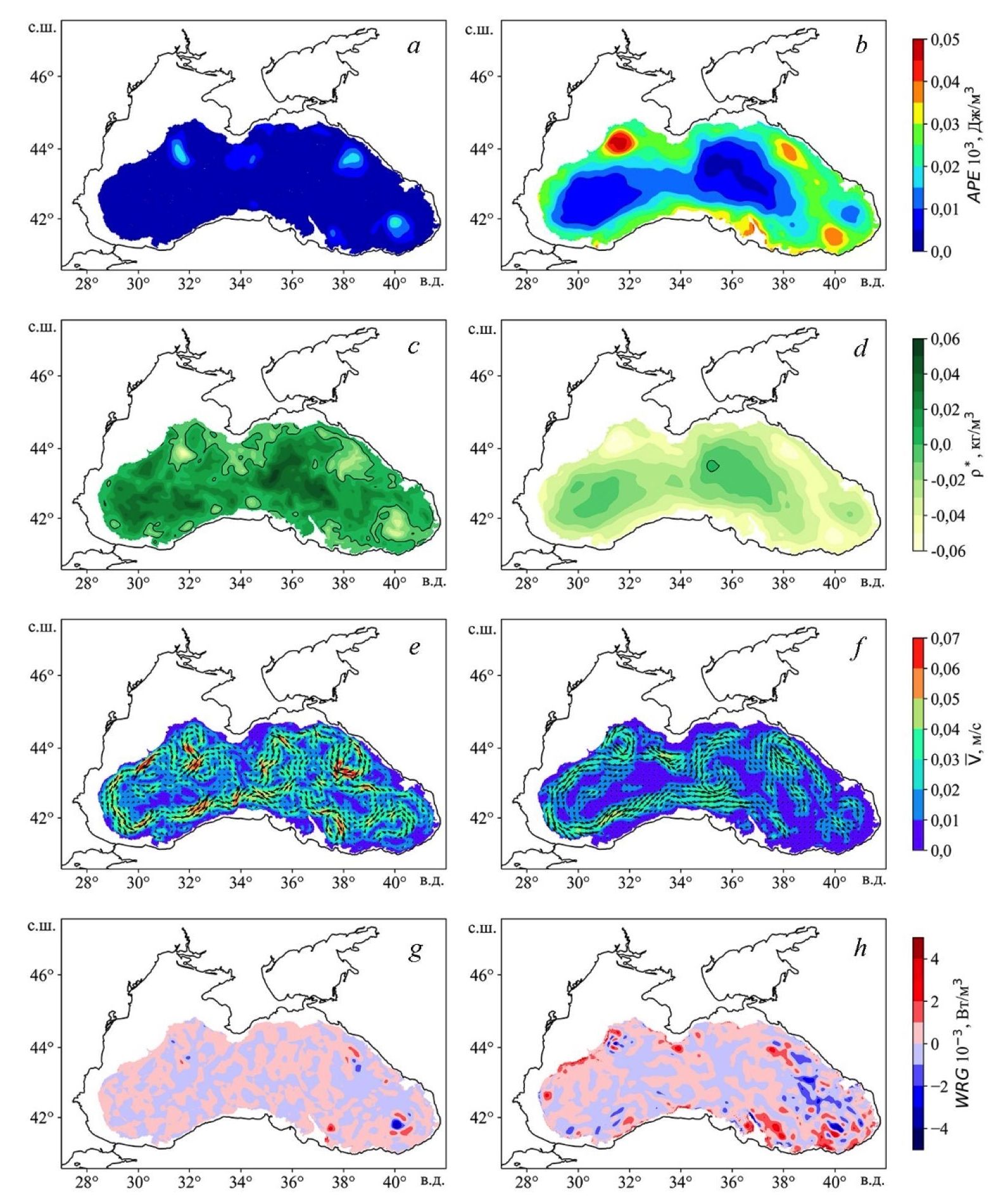 На глубинных горизонтах летом (рис. 4, a, b) различия в величине АРЕ более значимы, чем в верхнем слое: во-первых, экстремумы АРЕ в эксперименте 2 примерно в 2,5 раза больше, чем в эксперименте 1; во-вторых, наблюдается существенная разница в величине АРЕ между периферией и центральной частью моря. Сопоставление с полями аномалии плотности показывает, что увеличение АРЕ в эксперименте 2 обусловлено большими абсолютными значениями аномалии плотности на периферии бассейна (рис. 4, d), тогда как в эксперименте 1 наибольшие значения расположены в центре (рис. 4, c). Как показано в работе [18], такая структура полей АРЕ и аномалии плотности на глубинных горизонтах определяется мезомасштабной вихревой изменчивостью. Как видно из рис. 4, e и f в эксперименте 2 антициклонические вихри вблизи материкового склона имеют более четкую структуру и их расположение совпадает с повышенными значениями АРЕ. Кроме того, анализ компонент бюджета ДПЭ показал, что во втором эксперименте увеличивается вклад работы силы плавучести в зоне действия вихрей (рис. 4, h).