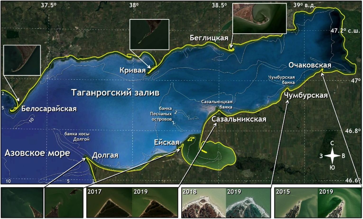 Р и с. 1. Батиметрическая карта и морфометрические особенности Таганрогского залива Азовского моря (сверху); примеры кардинальной перестройки кос (снизу)