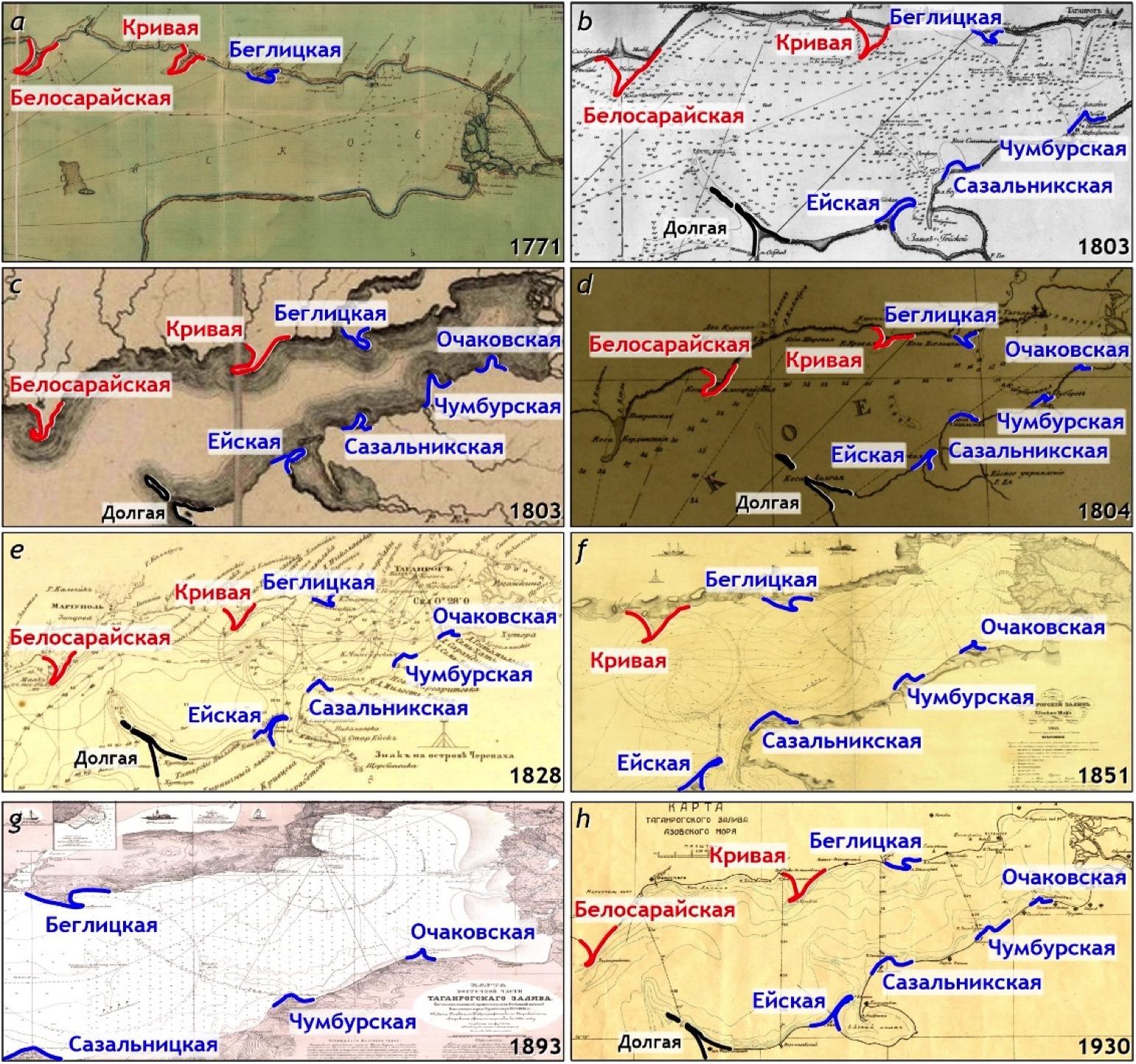 Отметим, что подобная картина наблюдалась и в прошлом (рис. 2). Красным цветом на рис. 2 выделены косы, направленные с востока на запад, синим – с запада на восток. На каждой карте приведен соответствующий год издания.