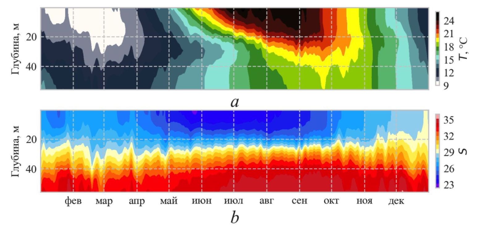 Р и с. 2. Внутригодовая изменчивость температуры (a) и солености (b) Мраморного моря, осредненных вдоль 27,38° в. д., по данным CMEMS 4 за 2007–2016 гг.