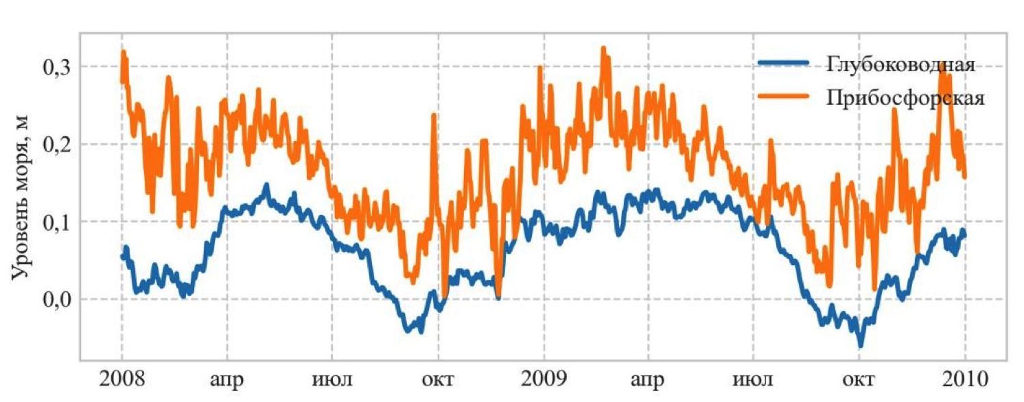 Р и с. 5. Уровень Черного моря, осредненный по глубоководной (для глубин более 500 м) и прибосфорской акваториям