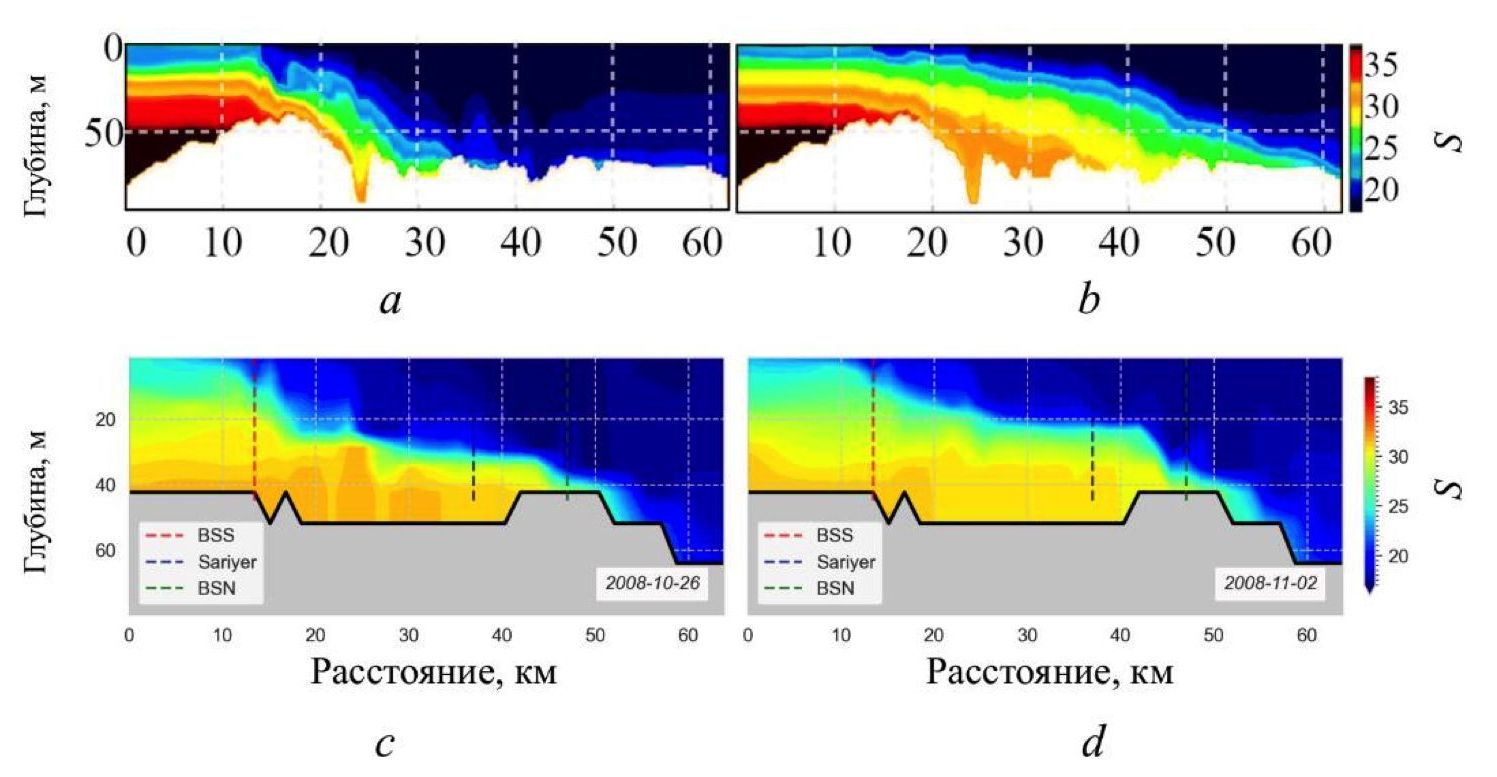 Несмотря на все неточности при воспроизведении конфигурации пролива (рис. 1, b), модель дает весьма правдоподобное распределение гидрологических характеристик вдоль оси пролива. В термохалинных полях отчетливо выделяются два слоя однородных водных масс, разделенных тонким слоем высоких градиентов. Это хорошо выражено на вертикальных разрезах солености вдоль пролива (рис. 3, фрагмент от 14.02.2008). Положение станций, вдоль которых построены разрезы, показано на рис. 1, b.