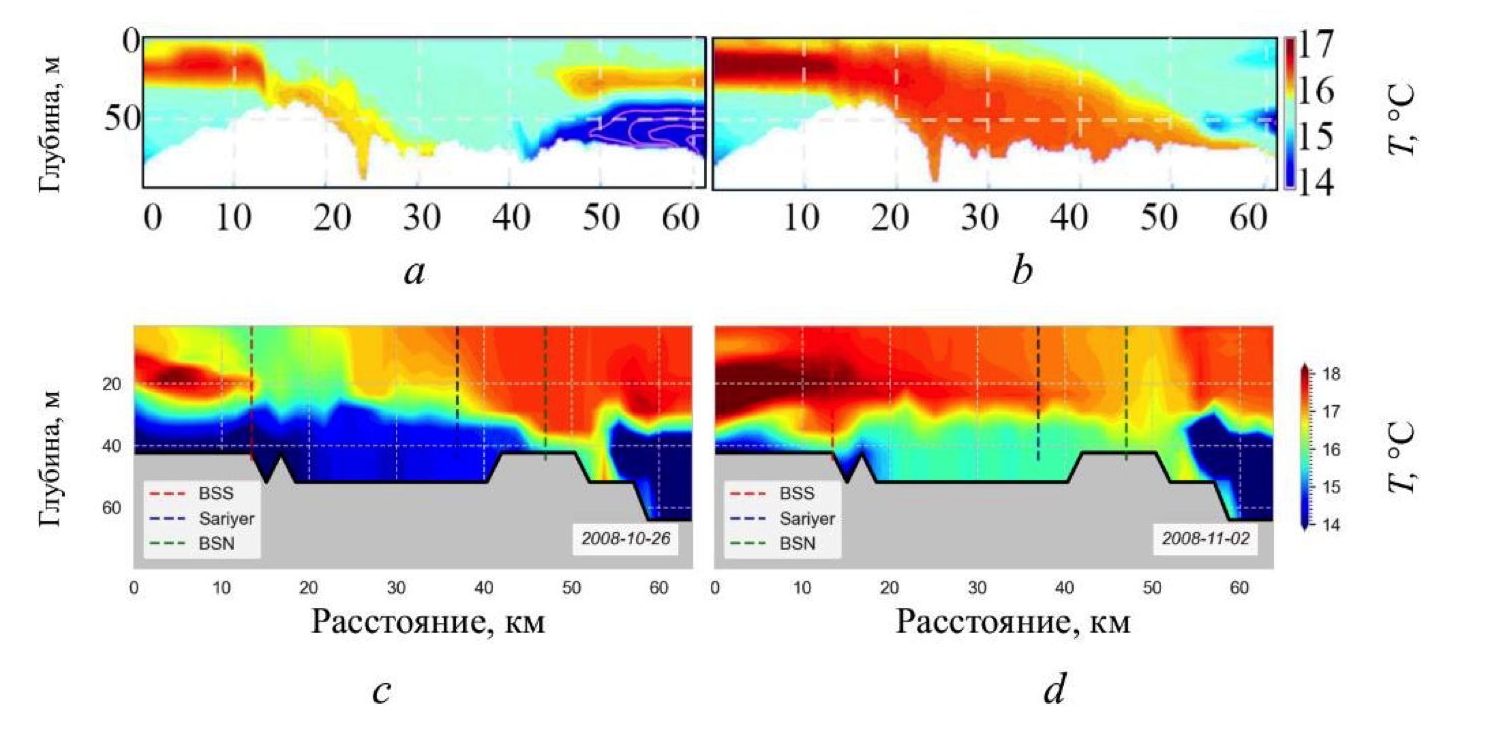 Для сопоставления с результатами работы [2] рассмотрим разрезы солености вдоль пролива на 26 октября и 2 ноября 2008 г. (рис. 6). Для октября наш расчет показывает несколько более протяженное распространение вод Мраморного моря на север по сравнению с расчетом из работы [2]. Тем не менее в нашем расчете так же, как и в указанной работе, наблюдается блокирование черноморских вод на границе с Мраморным морем. В обоих расчетах видна тенденция подъема границы раздела в период с октября по ноябрь. Придонные воды в наших результатах оказались более холодными (рис. 7). В температуре хуже проявляется процесс вовлечения более соленых, но при этом более теплых мраморноморских вод в бассейн Черного моря.