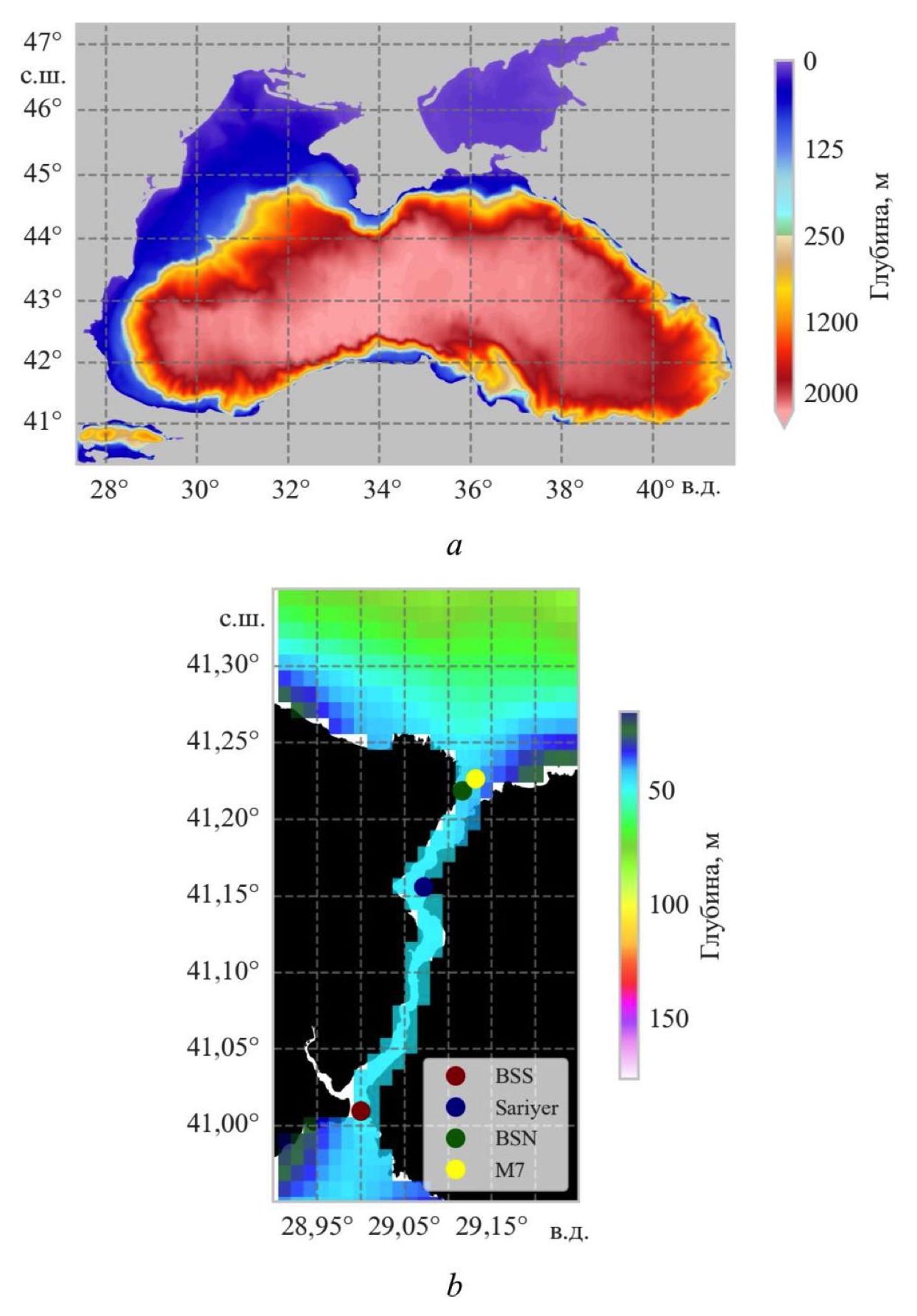 Р и с. 1. Топография дна для региональной конфигурации NEMO: для всего расчетного домена (a) и в акватории пролива (b). Конфигурация берегов в проливе приведена по данным сайта https://www.openstreetmap.org/; точками на фрагменте b отмечены положения станций по аналогии с работой [2]: BSS – Bosphorus Strait South, Sariyer – мыс Сарьер, BSN – Bosphorus Strait North; станция M7 взята из работы [6]