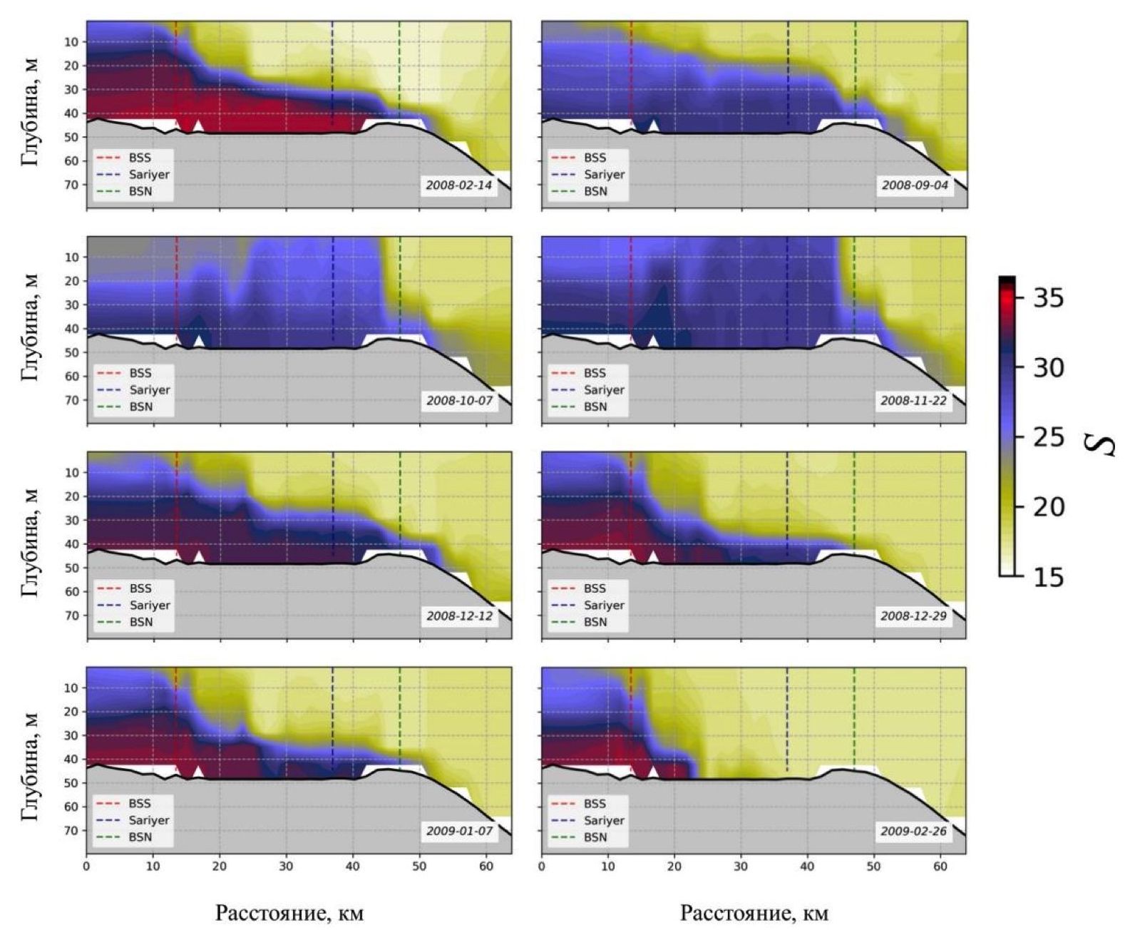 Сезонному ходу в нашем расчете подвержена также соленость нижнего слоя. В зимний период соленость может достигать 30–35 (рис. 3). При этом высокосоленая вода доходит по дну до порога на выходе из Босфора. Как правило, граница раздела слоев расширяется и поднимается к поверхности при подходе к Мраморному морю (рис. 3). В отдельные промежутки времени соленость у дна падает до 25–30 (рис. 3, фрагмент от 09.04.2008).