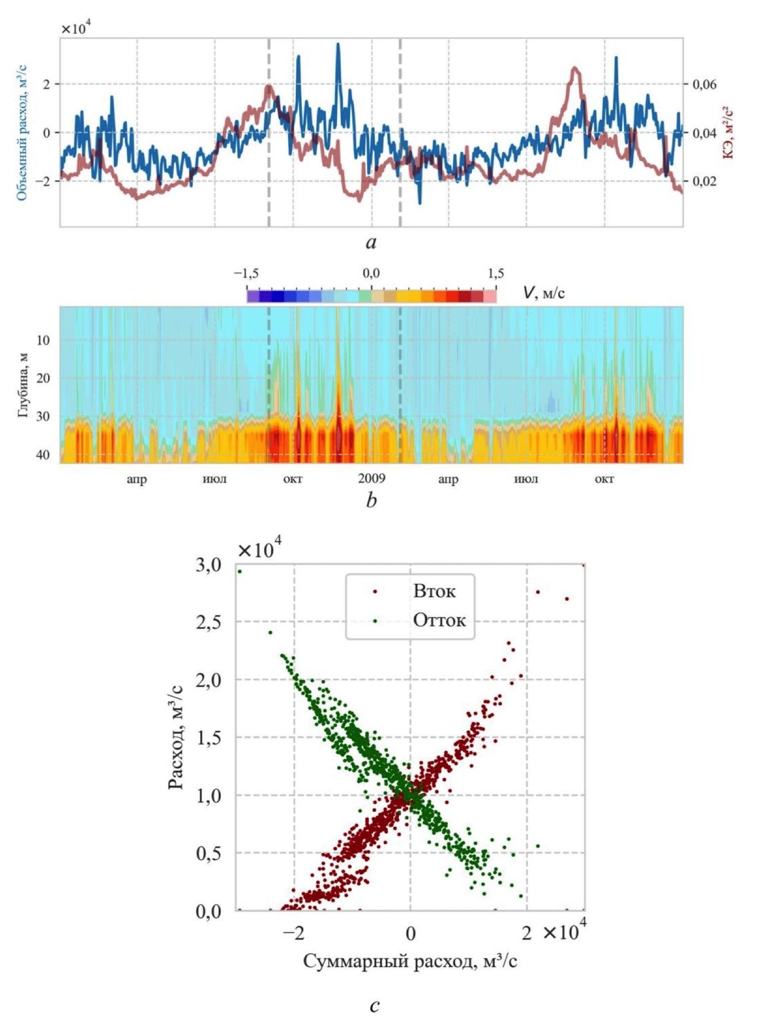 Р и с. 4. Динамика вод в проливе Босфор: а – средняя кинетическая энергия (КЭ) поверхностных течений в Мраморном море и суммарный баротропный меридиональный транспорт в окрестности точки BSN; b – меридиональные течения в северной части (BSN); с – значения втока и оттока как функции значений суммарного транспорта. Вертикальными штриховыми линиями показан период проведения наблюдений из работы 6