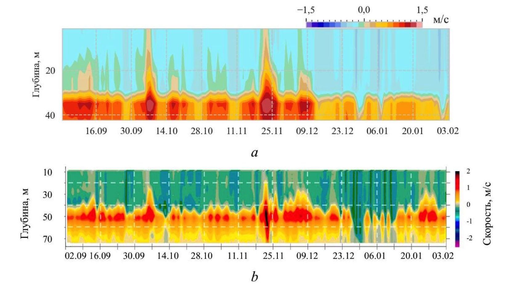F i g. 8. Comparison with observational data: meridional currents (m/s) in the northern part of the strait in the period September 9, 2008 – February 3, 2009 based on the results of simulation (a) and measurements from [6] (b)