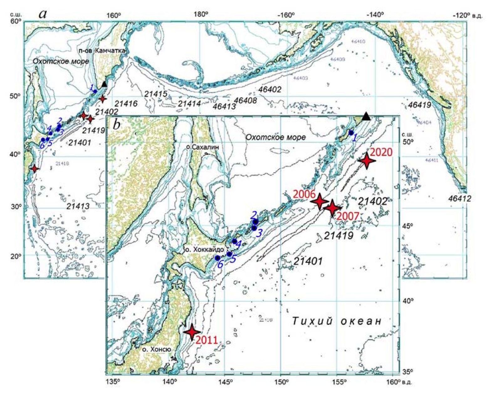 F i g. 1. Scheme of the computation areas: a – location of DART stations in the northern Pacific Ocean, the data from which are used for comparison with the calculated ones; b – the area near the Kuril Islands used in modeling the process of operational tsunami forecasting (black numbers indicate the location of DART stations; red stars – the earthquake epicenters with the year indicated; black triangle – the location of automated tide gauge “Vodopadnaya” (southeastern tip of Kamchatka); blue numbers – the settlements: 1 – Severo-Kurilsk (Paramushir Island), 2 – Kurilsk (Iturup Island), 3 – Burevestnik (Iturup Island), 4 – Yuzhno-Kurilsk (Kunashir Island), 5 – Hanasaki (Hokkaido Island) and 6 – Kushiro (Hokkaido Island))