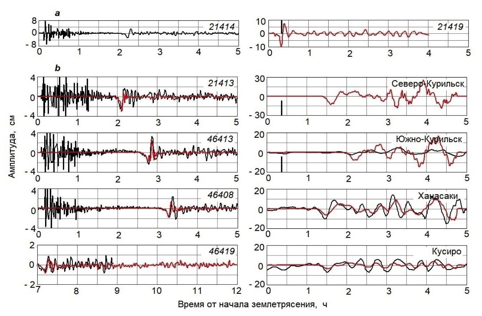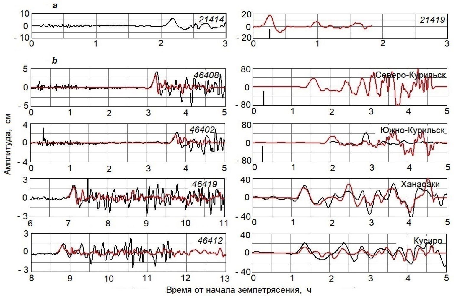 F i g. 3. Waveforms of the 2007 Simushir tsunami: a – recorded by the DART 21414 station (left) and reconstructed at DART 21419 station (right); b – recorded (black line) and computed (red line) based on the reconstructed data from DART 21419 station