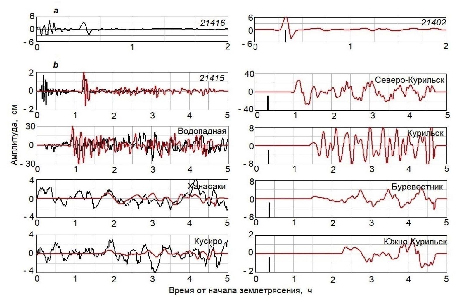 Р и с. 4. Волновые формы онекотанского цунами 2020 г.: a – зарегистрированная станцией DART 21416 (слева) и реконструированная на станции DART 21402 (справа); b – зарегистрированные (черная линия) и расчетные (красная линия) по реконструированным данным станции DART 21402