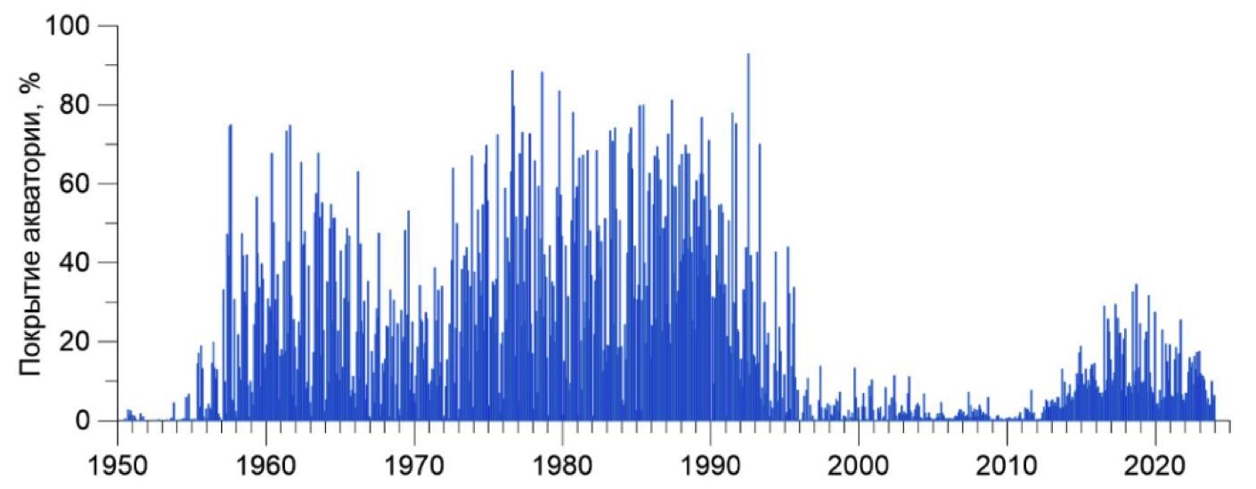На первом, самом длительном этапе для регуляризации пространственно-временной неоднородности исходных данных и фильтрации мезомасштабной изменчивости формировался начальный массив среднедекадных (10 сут) значений для всего периода наблюдений на сетке 10′ × 15′ [17]. Использовался метод оптимальной интерполяции 10 [18] с допущением изотропности пространственной коррелированности термохалинных полей в Черном море [19, 20] и автокорреляционной функции из работы [19]. В сравнении с исходной информацией (рис. 2, а) интерполированные данные имеют более равномерное распределение, тем не менее периоды до 1957 г. и 1997‒2013 гг. остаются наименее обеспеченными данными наблюдений. Относительная доля покрытия акватории Черного моря данными, сведенными в узлы сетки 10′ × 15′, в эти годы не превышает 10‒15% в месяц (рис. 3).