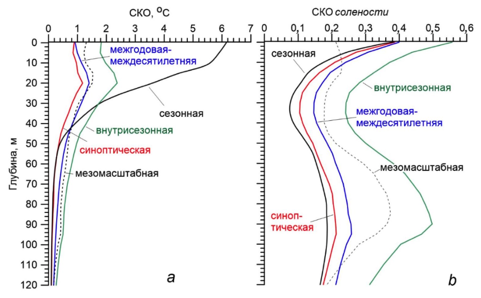 Рис. 4. Вертикальное распределение средних по Черному морю оценок временной изменчивости различных масштабов для температуры воды (a) и солености (b)